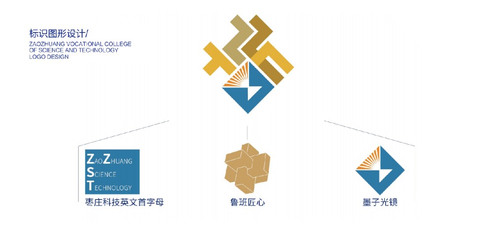 将枣庄科技学院首字母“ZZKJ”、鲁班匠心精神、墨子光镜元素巧妙融合,体现学院深厚的文化底蕴、严谨的治学态度和追求卓越的创新精神。