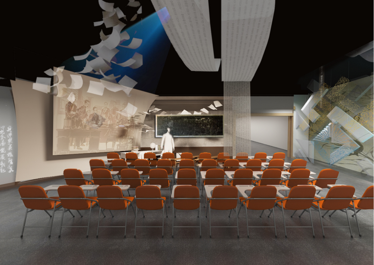 序厅以“墨韵流光”为主题,通过弧形屏幕动态呈现学校宣传影像,结合墨子光学元素、榫卯结构细节与历史长卷视觉背景,构建兼具科技感与文化张力的迎宾空间。