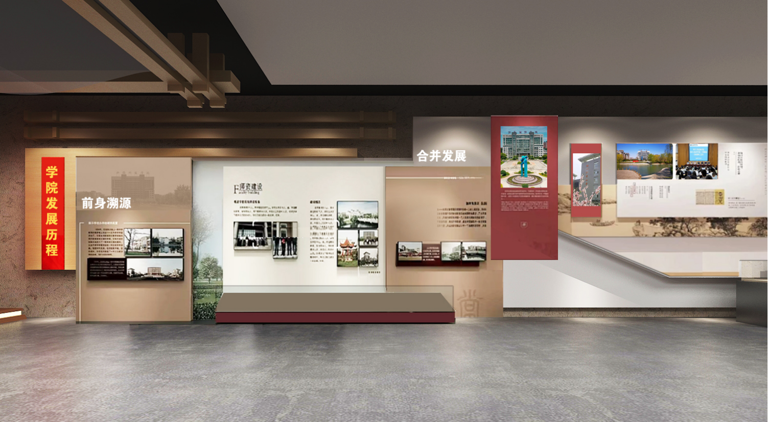 历史展厅以“历史长河”为核心互动叙事线索,嵌入多媒体触控与影像装置,生动还原学院发展的重要节点与动人篇章,引领观众沉浸式感知岁月流转中的校园变迁。