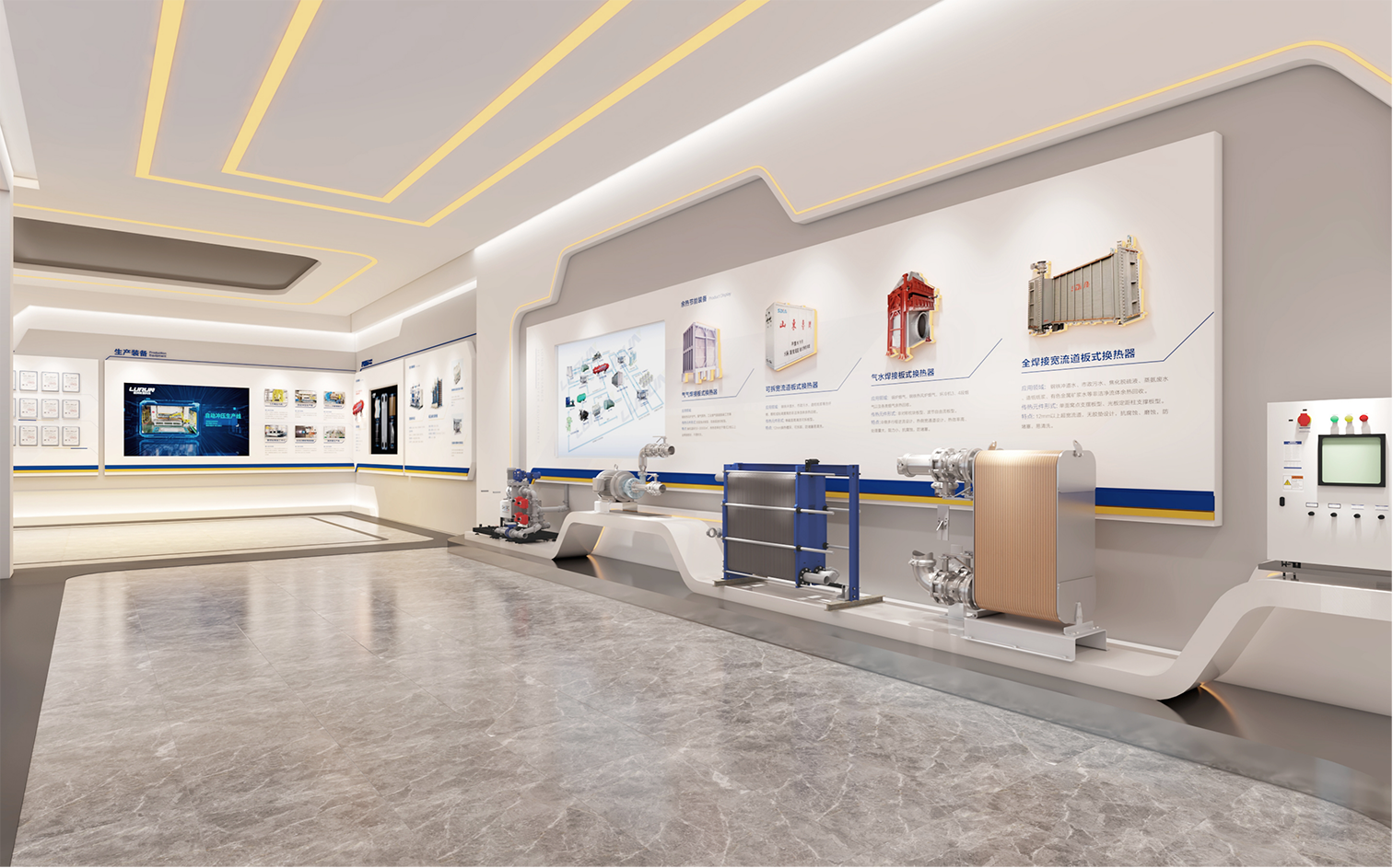 设计以“品质承匠心,鲁润达天下”为核心叙事,深度融合企业VI识别系统与换热器管道造型元素,构建贯穿始终的空间视觉基因。在兼顾实用性、美观性与经济性的前提下,以内容为纲,聚焦“好文化、好管理、好产品、好技术”四大板块,从文化厚度、技术深度、产品维度和品牌温度出发,架构企业历程、产品实力与未来愿景三大展区。通过沉浸式氛围营造、品牌故事融入与核心价值提炼,增强展厅感染力与记忆点,在有限预算内最大化空间价值,塑造更具竞争力与合作吸引力的品牌体验前沿阵地。