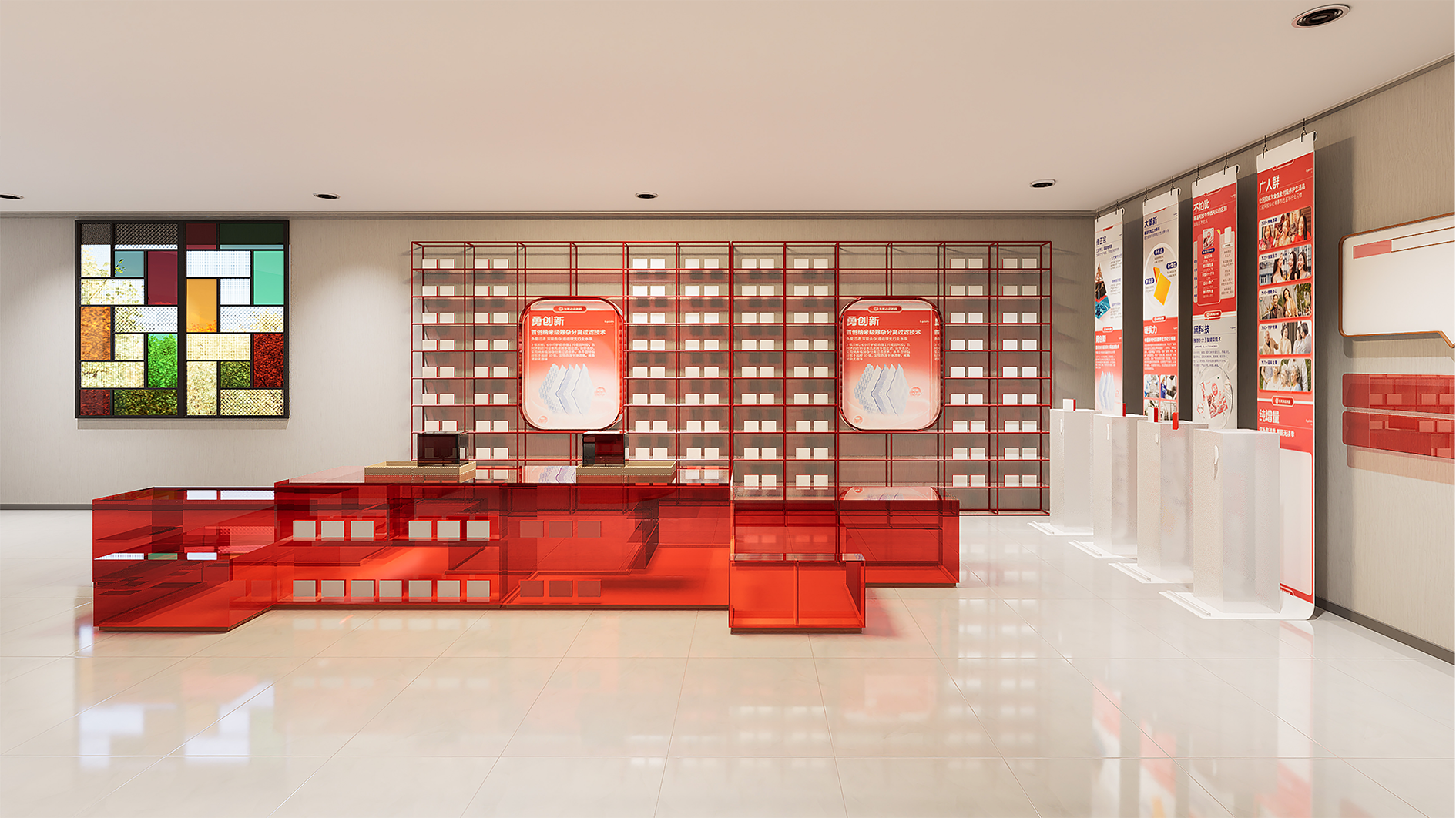 本案以“中国红”作为空间叙事的情感基调和视觉线索,统筹整体氛围营造与功能布局。中心展示区与养生文化科普区集中呈现阿胶系列产品,结合详实生动的文化阐释,引导观众深入感知阿胶的历史底蕴与养生精髓。