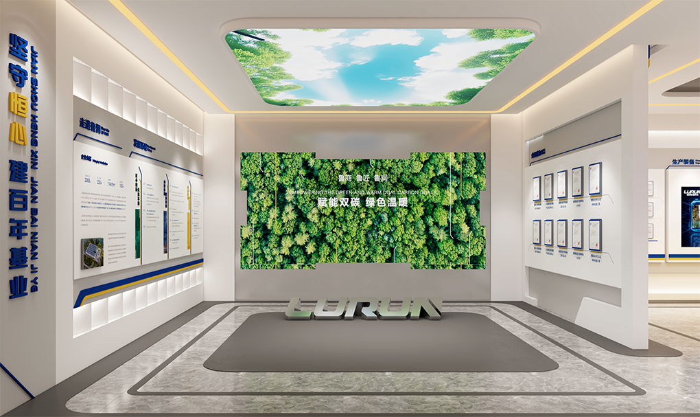 本项目为山东鲁润热能科技有限公司产品展厅改造提升工程,展厅位于鲁润工业园区内,为钢架结构单层空间,长21米、宽14.39米,展陈面积约300㎡。原空间结构方正、流线清晰,但存在展示形式单一、视觉系统松散、多媒体体验不足等薄弱环节。改造以“实用、美学、成本”三重平衡为原则,通过系统梳理内容架构、统一品牌视觉符号、增设多元展陈载体与互动模块,在不改变原有墙面构造的基础上实现展示体验焕新,致力打造集品牌传播与销售转化为一体的营销型展厅,全面提升品牌形象并驱动业务增长。