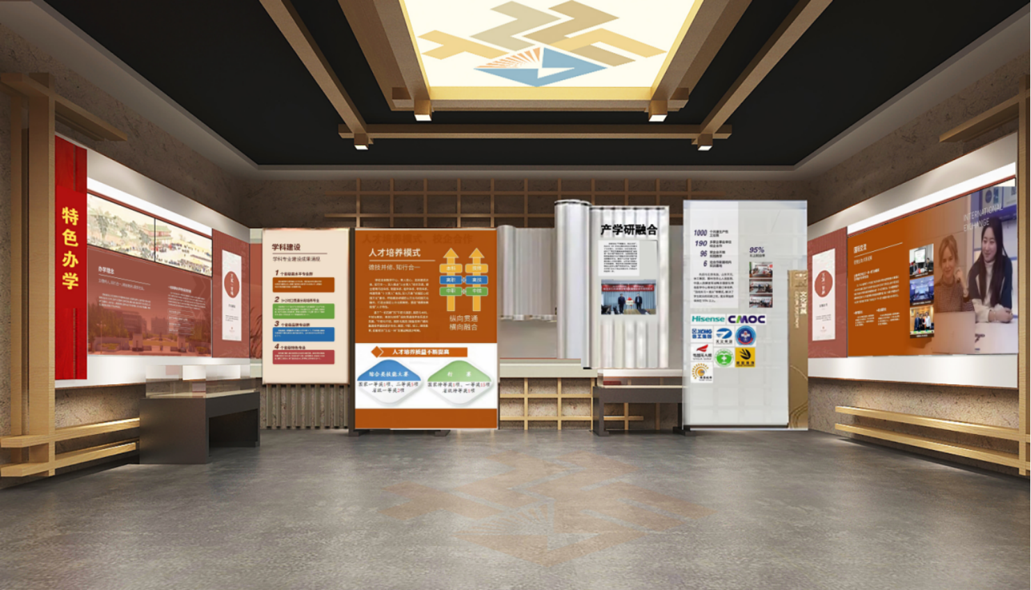 成果展厅综合运用海报系统、展板架构、实物模型及数据可视化界面,清晰呈现学校的办学理念、人才培养、校企协同与学科建设成果,凸显教育实践的厚度与创新成果的亮度。