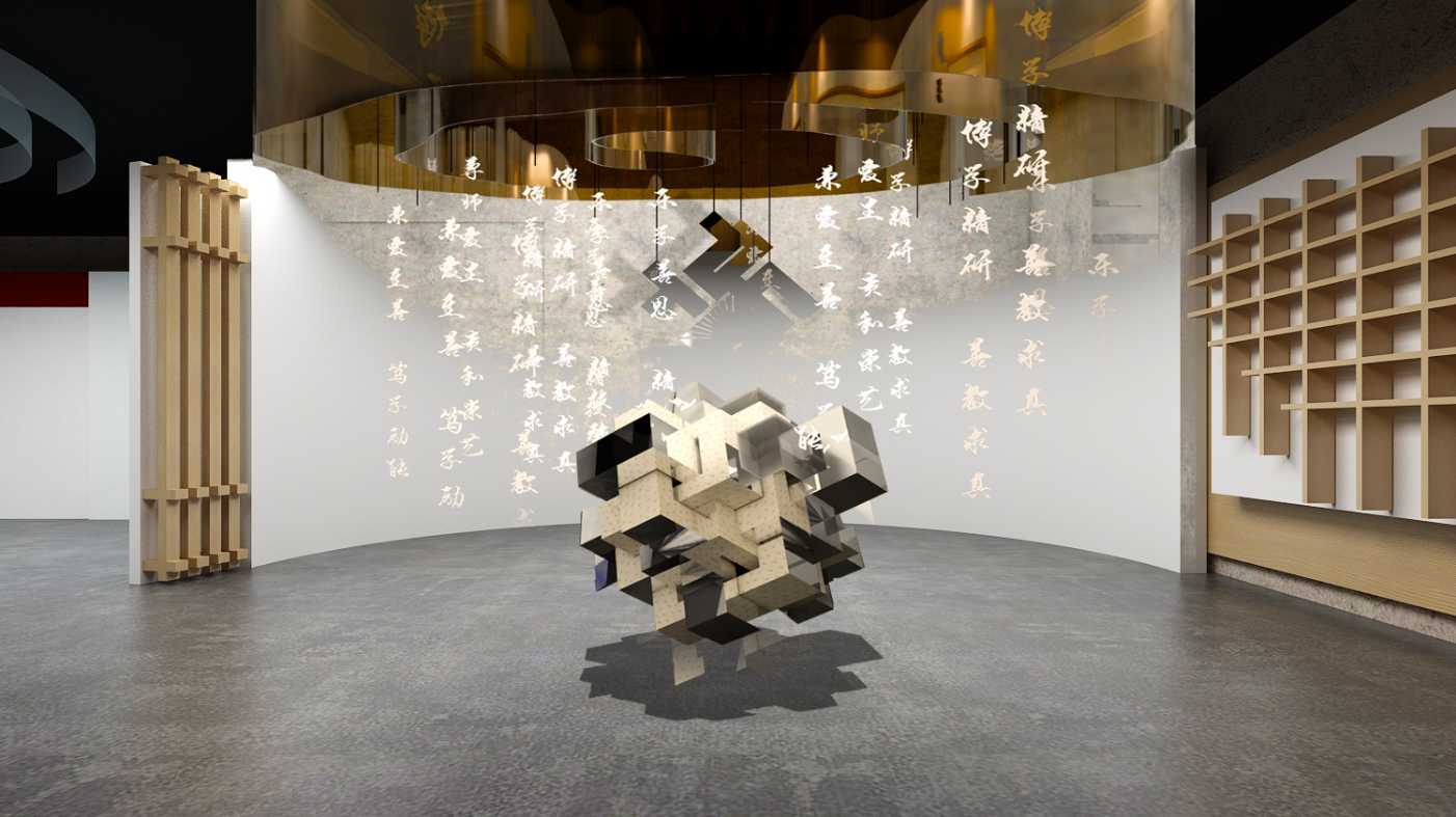 序厅以“墨韵流光”为主题,通过弧形屏幕动态呈现学校宣传影像,结合墨子光学元素、榫卯结构细节与历史长卷视觉背景,构建兼具科技感与文化张力的迎宾空间。